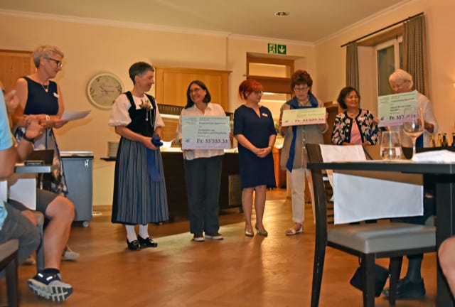 Der Höhepunkt des Abends war die Spendenvergabe von Fr. 100’000.–. Drei Institutionen, die sich lokal für Kinder, Familien und Senioren engagieren und unserem Motto «Im Dienste der Menschen» entsprechen, durften ein Zertifikat von je Fr. 33’333.33 entgegennehmen: der Verein für Altersbetreuung Unterseen, der Gotthelfverein Interlaken und Umgebung und der Eduard-Ruchti-Fonds Interlaken.